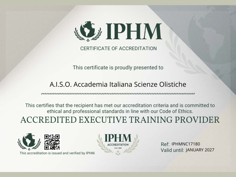 Al termine del corso: Attestato AICS (riconosciuto dal Dip. Nazionale Scienze Olistiche) + Certificazione Internazionale IPHM
